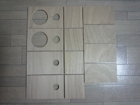 | いつものホームセンターで加工をお願いしました。丸穴は自分で開けます。 | |