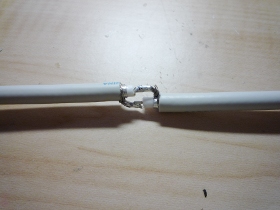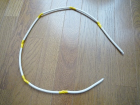 | 航空機をもっと遠くまで見たい場合はアンテナを自作します。特に私のお勧めは「コリニアアンテナ」です。詳しい説明はWEBでググッて頂いて、私の事例を記します。「コリニアアンテナ」とは簡単には、波長1/2の同軸ケーブルの芯線と編線を交互につないだものです。この本数を多くすればするほど横方向の指向性が強くなります。1090MHzの波長計算と今回の経験から、同軸ケーブル(4CFV)を130mmでカットします。今回は7段として製作しました。両端の被覆をむいて交互に接続します。 | |