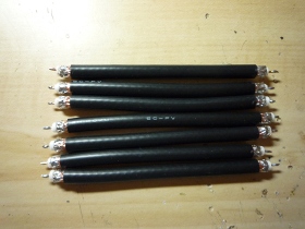 | コリニアアンテナの構成は簡単で芯線と編み線を交互にはんだ付けして行きます。ケーブルの先端は芯線と編み線をショートします。WEBには1/4波長同軸(芯線と編み線ショート)+1/4波長芯線のみとする先端ケーブルも記載されています。どちらでも良いと思います。 | |