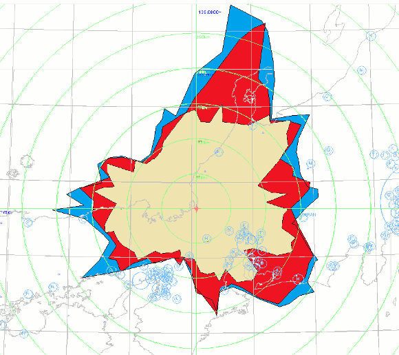 | 青い部分が今回の受信距離図です。見通しの良い方向は300kmに近づいています。やはり地形の関係から劇的とはなりませんでした。しかしながらアンテナでこれほど変わるのかと実感した次第です。 | |