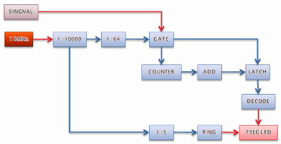 | 受信ICの局部周波数を測定して表示するのですがそのままでは周波数が高すぎてどうにもなりません。プリスケラーを用いて1/64分周します。 | |