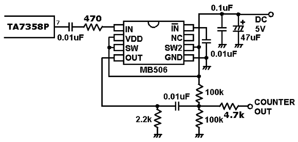 | プリスケーラーには富士通のMB506を使います。まだ現役で入手出来るICです。エアーバンド受信機の基板からは穴を開けるなどしてICの7ピンに接続して下さい。 | |
