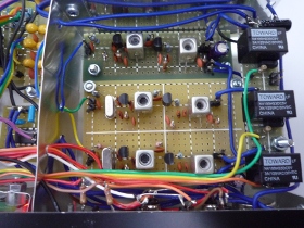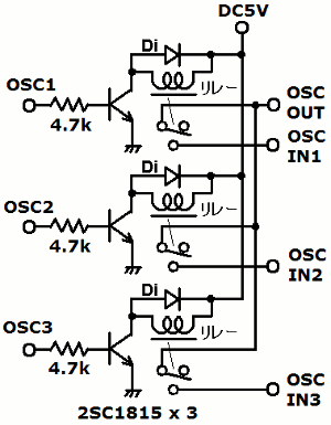 | 水晶発振回路は1ユニット分しか発振しませんが、局発出力を選択して周波数コンバータに入力します。リレーを使いました。受信周波数に合せてマイコンからコントロールします。 | |