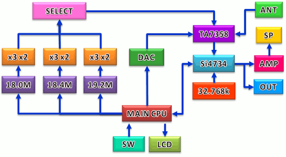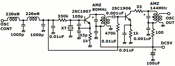 | 水晶発振子を2逓倍、3逓倍の合せて6逓倍して局発周波数としています。水晶発振子とコイルの並列のコンデンサの容量を変えて、3ユニット分準備します。一度に発振するのはひとつで良いのでトランジスタのベース電圧をコントロールしてひとつのユニットのみ発振させています。 | |