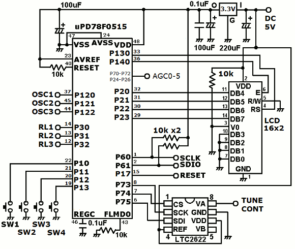 | 回路は10号機と同じです。今回AGCの効き具合を見るために対応してLEDを付けました。上記回路図には載っていませんが、ポート表を参考にして下さい。 | |