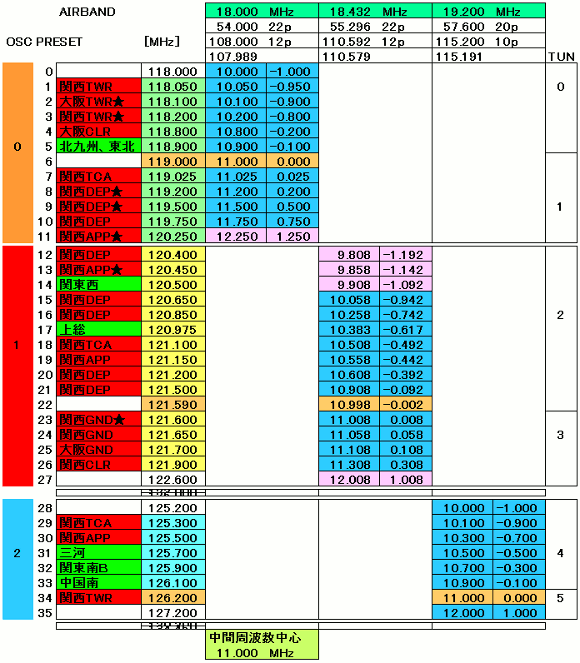 | 今回は18.000MHz、18.432MHz、19.200MHzを局発の基にします。これを3倍してから2倍することで局発の周波数とします。それらの周波数をセンターにして11.000MHzの中間周波数を中心に±1MHzの範囲を受信します。すこしはみでる部分もありますが、空港を中心とするエアバンドに対応出来ていると思います。特に「★」がメインの周波数と思います。 | |