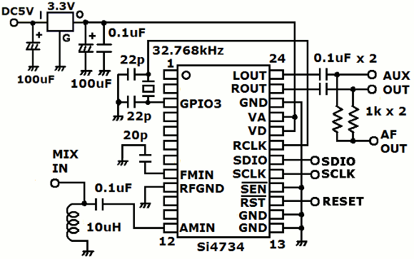 | もう定番の回路ですね。DSPラジオとしての特徴をスケルチとAGCに生かしています。このICは受信中もRSSIとSNRをリアルタイムに数値で取り込むことが可能です。 | |