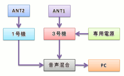 | 1号機と併用してダブル受信を行いました。日々研究中でして、受信とプロットはまるで生き物のように毎日変化しています。ダブル受信の構成を示します。 | |