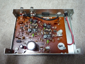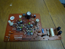 | 基板を取り出して内部を少し確認します。ブースター自体はDC20Vで駆動しています。トランスとAC20Vを付加する部分は完全に切り離すことにします。ケースに入るように基板を加工します。電源回路は内部に持たず、外部から入れる仕様とします。 | |