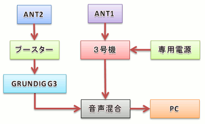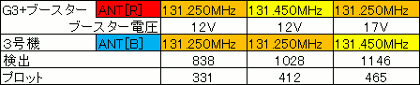 | ブースターの電源が完成していないので、3号機の専用電源の1系統余っている出力から電源を取りました。この時下の表にはDC12Vと記載しています。純正品がDC20Vで動作していましたので、電圧が低い可能性があります。そこでACアダプターから直接電源を取った場合も行いました。これをDC17Vと記しています。やはり電圧が高いほうが感度が良くなるようです。 | |