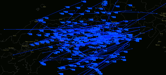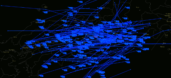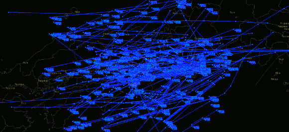 | 新記録を樹立した軌跡はさすがに圧巻ですね。二つの周波数を同時受信したので、ちょっと変わった軌跡になっています。個人的にはもっと長距離のプロットを期待したいです。マンションではこれが限界でしょうか。しかしながら1日で1000機以上も上空を飛んでいるのですね。 | |
