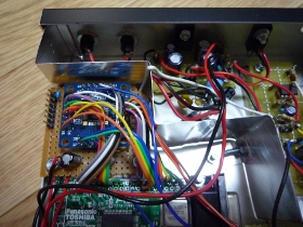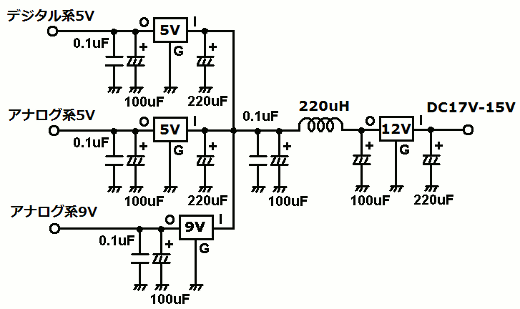 | 電源回路には新たにDC12Vのレギュレータを追加しています。合わせてノイズも取る(?)ようにしました。ACアダプターはトランスタイプの12V仕様を使うと17V程度の電圧が出ていますので、レギュレータで安定化しています。 | |