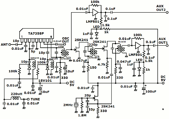 | 全体構成も全く同じですが、一部回路の定数を変えています。シングルスーパーヘテロの部分のLMF501のカップリングコンデンサを0.01uFに戻しています。3号機も同様に変更しました。 | |