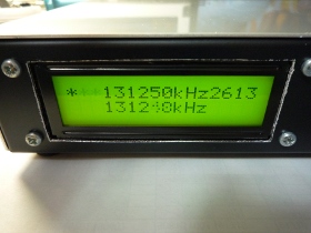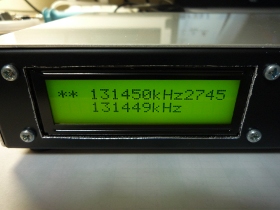 | 16文字2行もありますが、表示は極めてシンプルです。動作中は常時局発周波数を下の段に表示します。±2kHz範囲内で常時自動調整しています。 | |