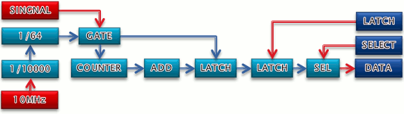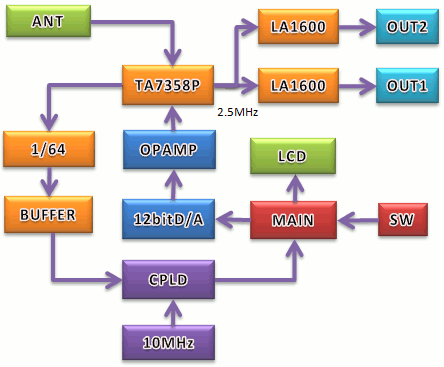 | 局発からの周波数は1/64分周されてCPLDへ入力しますので、内部でも1/64分周回路を入れて見かけ上の周波数を合わしています。(今回は内部回路の掲載はいたしませんので、実際にデータソースを見て下さい。) | |