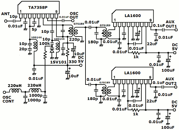 | 今回より復調部にはLA1600を使用しました。このICはもともとスーパーヘテロダインのAMラジオを構成出来る部品ですがこれをストレート方式として使用します。従来より使っていた3端子の復調ICはAGCに難があり、過大な信号に対しては歪む傾向にありました。LA1600はより強力にAGCが効きますのでそれほど信号が歪むことはないと思います。 | |