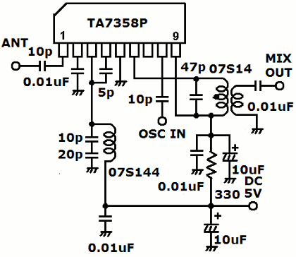 | 周波数変換後は11MHz付近の周波数になります。今回は14MHzのコイルと47pFは大変良くマッチしました。最近はTA7358をすっかり見かけなくなりました。そろそろ買いだめをしないと。大変重宝するICですから。 | |