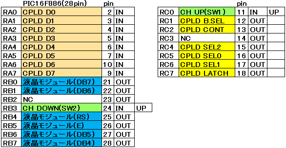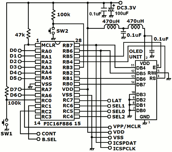 | 最近の定番のPIC16F886で仕上げました。周辺回路も同じ構成にしていますので、ソフトもサクッと出来ます。 | |