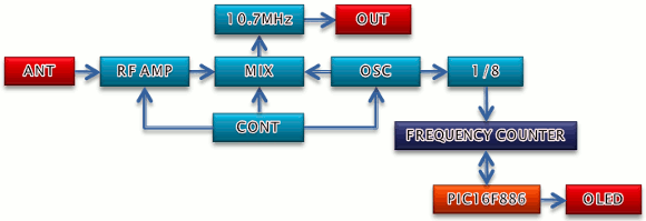 2006年4月号付録のCPLD基板を使用します。 2)周波数表示は100Hz単位まで行います。 3)局発周波数に10.7MHzを加算して受信周波数表示するモード、局発周波数をそのまま表示するモード、他機器の周波数カウンタとしても使えるモードを用意しました。 4)周波数表示は8文字2行のOLEDモジュールを使用します。 5)表示制御用にはPIC16F886を使用しました。最近の私の製作の定番です。 |