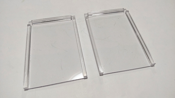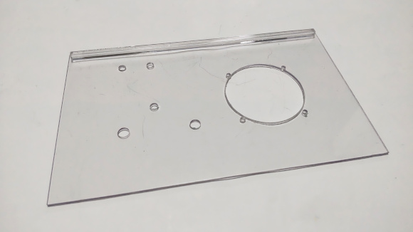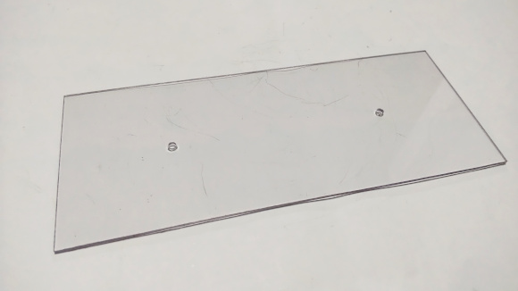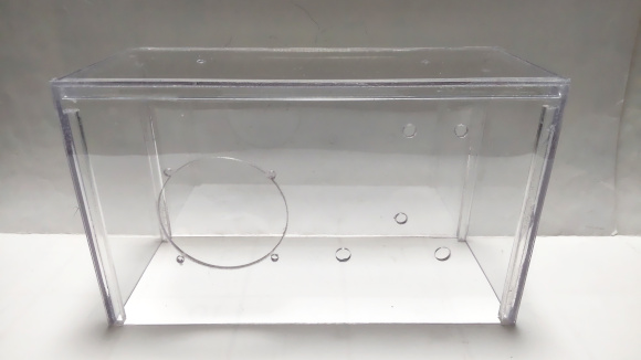 | ここからは透明ケースの簡単な説明をします。透明板はPET製を使います。少し柔らかいですが、アクリル板のように加工時に突然割れることはありませんので、使い易いです。 | |