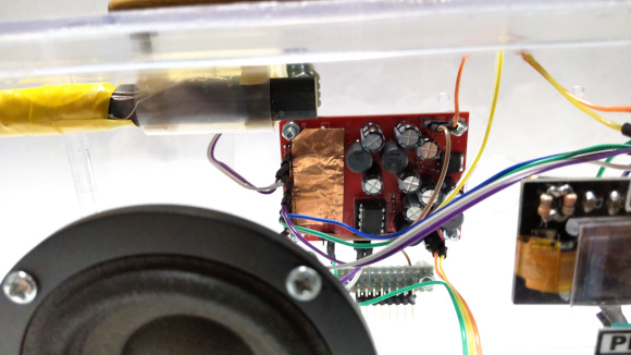 | DSPチップを銅箔テープで覆ってノイズからの影響を低減しています。銅箔テープは必ずフィルムタイプの両面テープで貼り付けます。特にGNDとかには接続していませんが、効果はあると思います。 | |