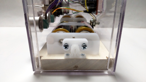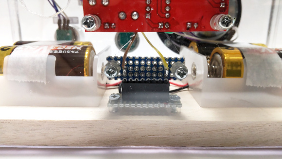 | 底板は木材としました。電池ボックスをねじ止めし易いです。 | |