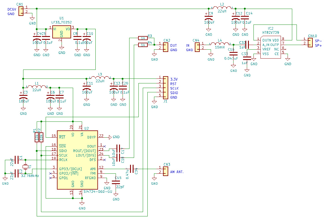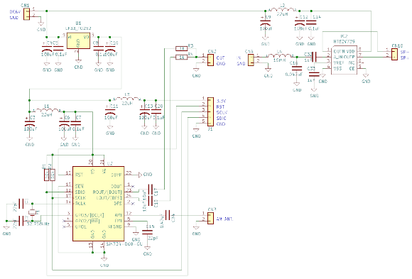 | 前回作製したFMラジオと同様にケースは透明にしました。良いですね。電源回路、DSPチップ、アンプの回路図はこちらです。 | |