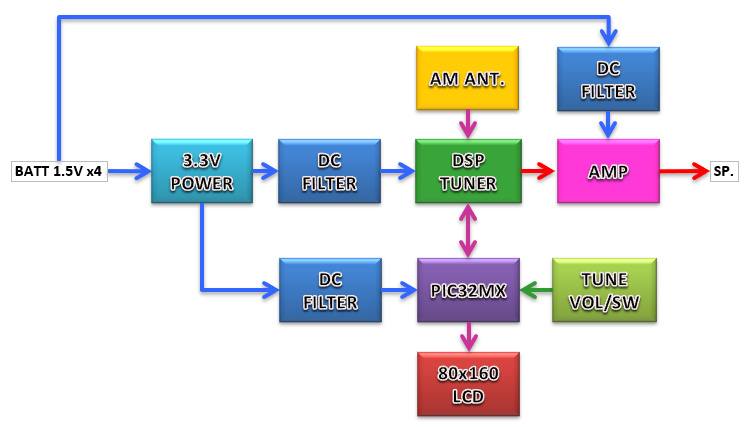 | 今回のラジオの特徴を記します。 ・受信周波数は522kHz〜1620kHz。 ・選局はマニュアルとプリセットが可能。 ・プリセット局数は13局。 ・電源回路はフィルターを構成して回路ノイズを低減。 ・DSPチップは旧シリコンラボ製のSi4734を使用。(Si4735も使用可能) ・受信周波数は80x160ドットのカラー液晶に表示。 ・駆動マイコンはPIC32MXをクロック8MHzで使用してノイズを低減。 ・カラー液晶の画面更新は最小限に留めてノイズを低減。 ・銅箔テープでノイズを低減。 ・DSPラジオ特有の高音出力ひずみはローパスフィルタで低減。 ・スピーカーアンプ搭載でスピーカー内蔵。 ・単二電池4本駆動。電池交換しやすい構造。 完成した姿はこちら。 |
