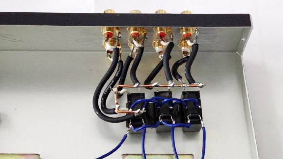 | 3系統入力の他に、選ばれた機器の出力も備えています。これは私のシステムの構成上、ヘッドフォンアンプやスペクトルアナライザなどに接続するためです。なんとか端子を埋め込みました。配置はもうキチキチですけど。 | |