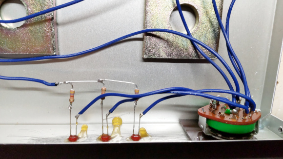 | ロータリースイッチは4接点のものを使っていますが、使っているのは3接点のみです。スイッチの位置によってリレーを切り換えます。同時にインジケータのLEDも切り換えます。この辺りは回路図を見て下さい。 | |