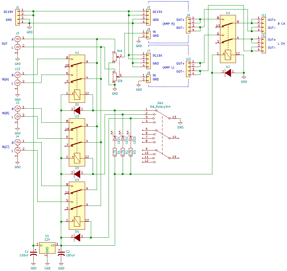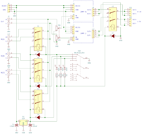 | 従来のアンプでも2系統の入力切り換えを行っていました。この部分を撤去すれば3系統のリレーを置けそうですね。 | |