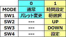 | レコード針タイマーの動作にはふたつのモードがあります。通常モードと時間設定モードです。回路上操作ボタンは4個あります。通常モードではSW1しか使用しません。これは液晶のカラーパレットを変更するボタンです。好みの色を選ぶことが出来ます。時間設定モードは、例えばレコード針を交換した時に、その針の時間に再設定する時に使います。複数の針を交換して使う時に重宝するかと思います。時間設定モードに入るにはケースを開けて、SW4を押しながら電源を投入します。少し時間をおいてからSW4を離すと、時間の3桁目が点滅します。その点滅している桁をSW2,SW3でUP/DOWNして時間を設定します。SW1を押す毎に桁が移動しますので、全ての桁を設定したら再びSW4を押して決定します。この時間データはEEPROMに記憶します。 | |