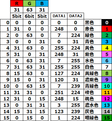 | 液晶に表示される色は上図のように16色です。私の製作の定番の色です。今回は画像データは同じものを使って、色のパレットを変更することで、液晶に表示される画像の表現を変えています。 | |