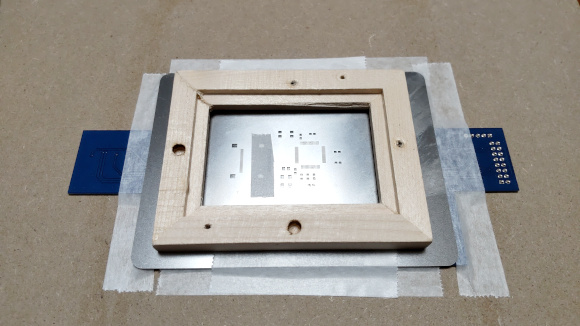 | 今回はひとつの液晶しか接続しないので、はんだ付けの必要でない部分はテーピングします。メタルマスクを基板にぴったりと合わせてテーピングしておきます。先ほどの枠をメタルマスクの上に置いて押し付けながら、クリームはんだを塗ります。メタルマスクは120um程度なので、しっかりと上から枠で押さえつけることで余分なはんだを塗らずに済みます。クリームはんだは、しなるプラ板などで塗ると良いと思います。はんだが薄くなった分、部品を合わせて置くのがとても苦労します。 | |