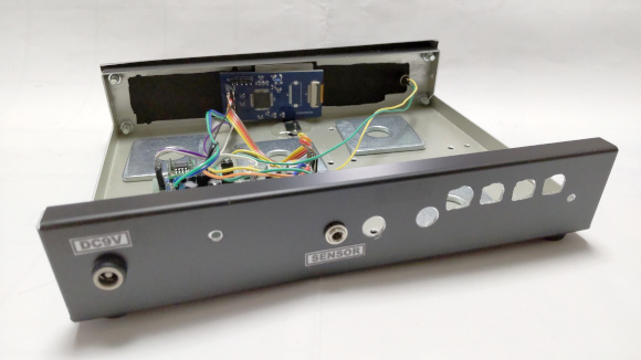 | 奥に見える前面部分の液晶周りはとても良い仕上がりですね。背面はACアダプターとセンサーの入力端子です。センサーとはオーディオのステレオケーブルで接続しますが、機器側に電源を投入しない状態でケーブルを抜き差しして下さい。 | |