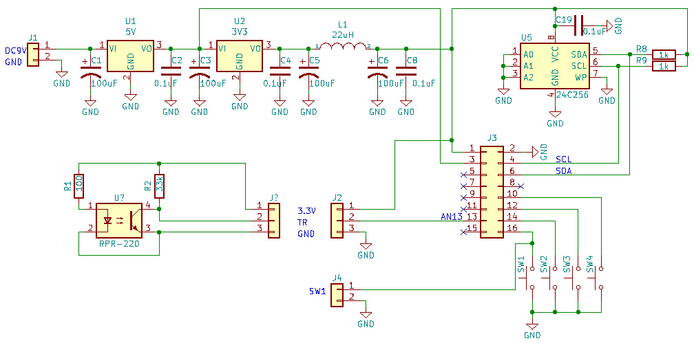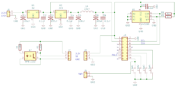 | マイコンボードの周辺回路は極めて簡単です。電源回路とデータを記憶するEEPROMとボタンスイッチです。アナログプレーヤー側にはトーンアームの位置を検出する回路を取り付けています。上の回路図では反射型フォトセンサ(RPR-220)周辺の部分です。この検出回路については過去の製作を参照して下さい。 | |