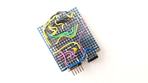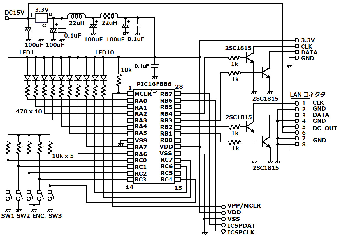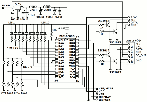 | PICマイコンの手持ちがSOPタイプしかなかったので結構詰まってます。DIPタイプにするともう少しスペースが楽かもしれません。 | |