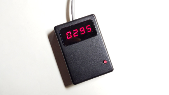 | コントローラから受信した数値を10進4桁で表示する装置です。数値を受信した時に約10秒程度の表示を行います。消費電力を減らすために通常表示は消えています。そこで今どの数値で制御しているかを知るためにSWを付けています。このSWを押すと約10秒間数値の表示を行います。電源の元がACアダプターなので表示を消す意味があるかと思われるかもしれませんが、表示することによって発生するかもしれないノイズを抑えることが可能になります。4極ジャックには電源とGNDも割り付けていますので、電源を投入したままでの4極プラグの抜き挿しは絶対やめて下さい。必ずプラグを挿した後に元の電源を印加してください。 | |