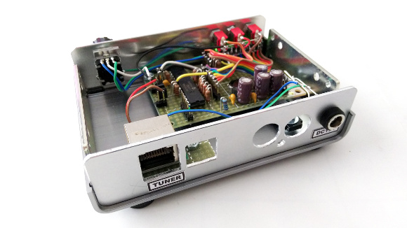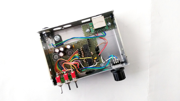| スイッチは左側からSW-AM切換え、Lo-Hi切換えです。一番右側のスイッチがロータリーエンコーダーのクリック倍率の切換えです。10bit分ですので1024のクリックがあります。周波数の低いところから高いところまでを回すのも大変ですからスイッチを切換えることで10倍のスピードで操作が出来ます。どの位置で放送周波数とアンテナチューナーとがカップリングするかは各自で操作することで体感して下さい。特に中波の同調はクリックの全エリアを使いませんので慎重な操作が必要です。しかしながら制御電圧が極めて安定しているので、ゆっくりエンコーダを回していると、浮き上がるように放送が聞こえてきます。 | |