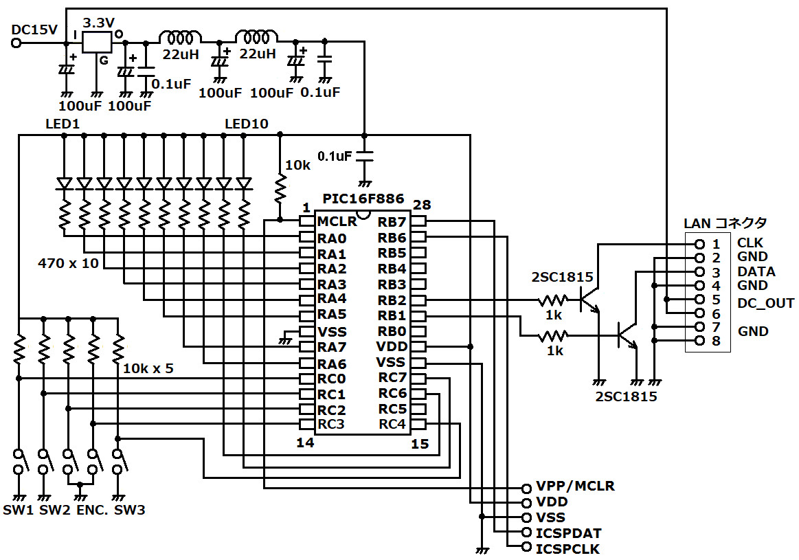 | 従来のシステムでボリュームで電圧制御していた部分を屋外の制御ユニット側に配置して室内の操作ユニットはその電圧を細かく制御するためのデータを送り出すことに専念するようにします。電圧制御用のデータはロータリーエンコーダーで操作します。データはシリアルで、クロックとデータでコントロールします。出力はオープンコレクタにします。マイコンは3.3V駆動です。電源からのノイズを低減するためにLCフィルターを組み込んでいます。どの程度の効果があるかはわかりませんが、無いよりは明らかに良いと思います。 | |