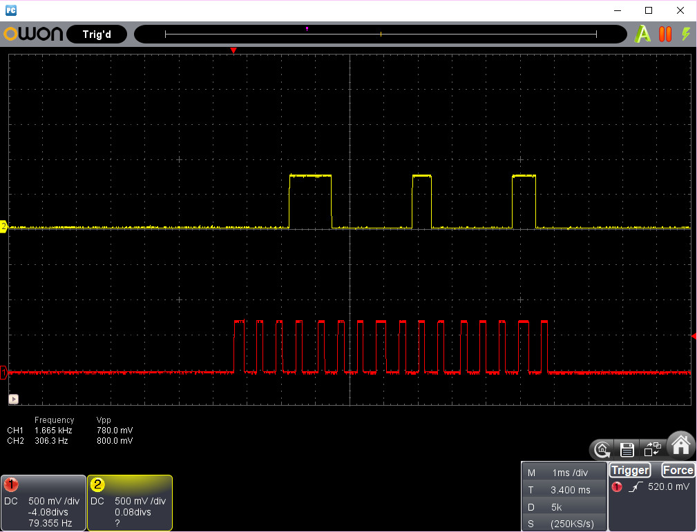 | 出力トランジスタのベース電圧を測定しました。赤色がクロックで黄色がデータです。きちんと16bitのデータが送れています。 | |