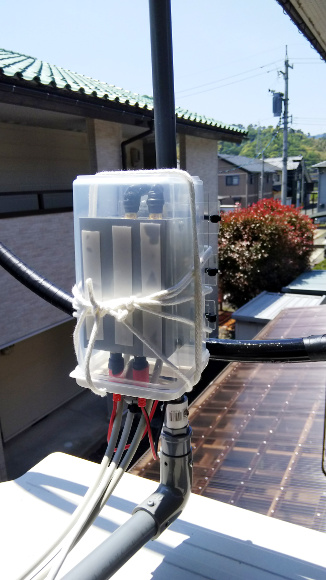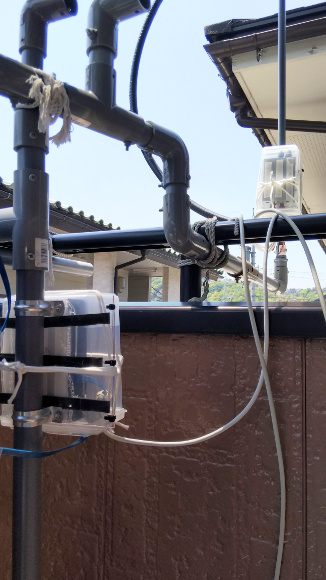 | 左側手前が制御ユニットです。今までは室内からアンテナチューナーをコントロールしていたことを考えると充分近い距離となって安定した制御が期待出来ます。制御ユニットもポリプロピレンの容器に入れてループアンテナを支える塩ビパイプの支柱に取り付けました。風雨を避けるためにベランダの手すりより下側に設置しています。 | |