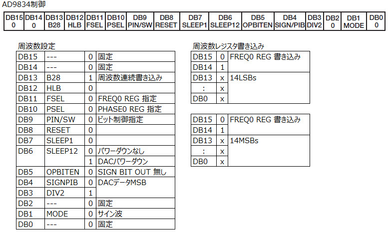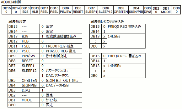 | 過去製作の記事の中でも説明していますが、上図にポイントを記します。ひとつのデータは16ビットで、周波数設定、周波数レジスタ下位、周波数レジスタ上位の順にICに送り込めば周波数が設定されます。周波数の正弦波信号を出力する時は周波数設定のDB6を[0]、しない時は[1]にすればOKです。詳しくはソースを見て下さい。 | |