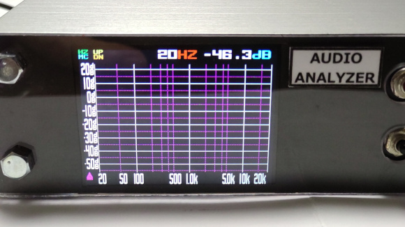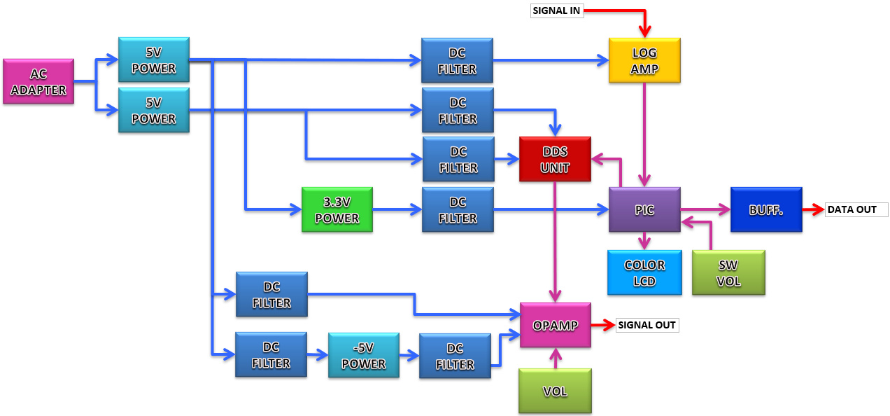 | 今回の特徴はカラー液晶で特性のグラフ表示が出来ることです。オーディオの周辺にPCがなくても周波数特性を確認することが出来てとても便利になりました。構成は過去の製作と同じで正弦波の信号発生と信号レベル測定器、特性表示液晶を内蔵しています。周波数は20Hz〜20kHzに限定しました。正弦波信号発生の周波数ステップはレンジによって異なりますが、最小1Hzステップが可能です。オーディオ用として割り切った結果です。 | |