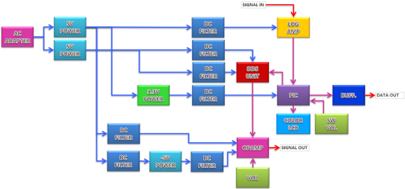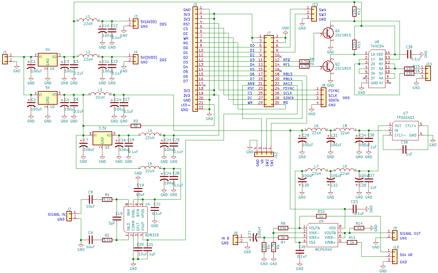 | LOGアンプはAD8310を使用します。出力のOPアンプはMCP6H92を使用します。マイナス5Vの生成にはTPS60403を使用します。どのICも半導体入手困難により過去製作から取り出して使用しています。マイナス5V生成のICは大量のノイズをばらまきますので、LCフィルタを増強しています。これで良いのかどうかはちょっとわかりませんが、一応納得しています。測定データをPCに送り込むためのインターフェイス回路も付けています。PCとアイソレートするために回路を工夫しています。この辺りのPC接続については後日記事で詳しく説明したいと思います。 | |