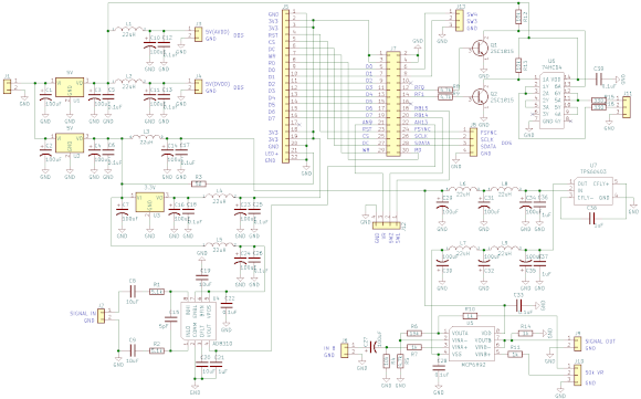 | 電源回路はLCフィルターでノイズ対策をしています。電源が安定することで綺麗な波形が出力されることを期待します。メイン制御と液晶表示はPIC32MXマイコンが行います。PIC32沼に入るとなかなか抜け出せませんね。 | |