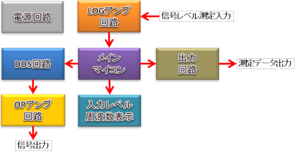 | 正弦波はDDS回路モジュールを使用します。OPアンプを通して出力します。信号レベルを測定するLOGアンプ回路は電子工作の実験室:http://www.picfun.com/を参考にさせて頂きました。この場をお借りして作者の方に感謝いたします。測定データはカラー液晶に表示します。記録を残すという意味でPCに接続してのグラフ表示も可能です。 | |