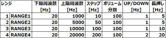| 周波数レンジはSW2を押す毎に変化します。オーディオ帯域に限定していますので、レンジは4種類です。バンドパスフィルターの測定などには細かい周波数が調整出来ますので、重宝するのではないでしょうか。周波数は大まかにはボリュームで設定して細かいところはSW3/SW4で設定が可能です。 | |