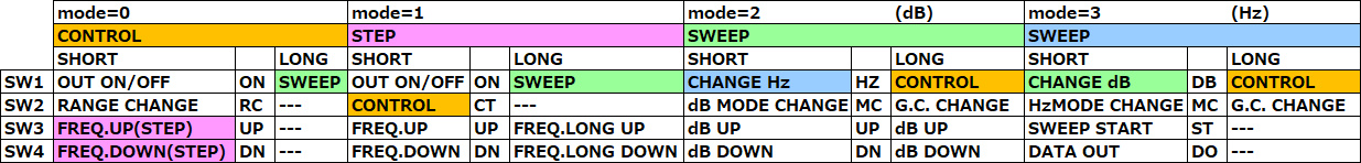 | 内部的に4つのモードが存在します。電源を入れるとmode=0 「CONTROL」モードになります。まだ正弦波は出力されていません。SW1を押す毎に出力ON/OFFのなります。このボタンを長押しすることでmode=2 「SWEEP」モードに入ります。液晶画面にボタンSWの機能を2文字で表示していますのでなんとか使えると思います。 | |
