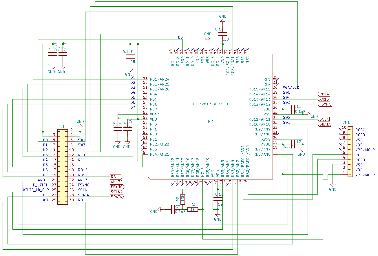 | マイコンはPIC32MXシリーズ品です。カラー液晶モジュール駆動には必須ですね。今までの自作ゲーム機でマイコンのプリント基板を作製していますので、それを利用しました。 | |